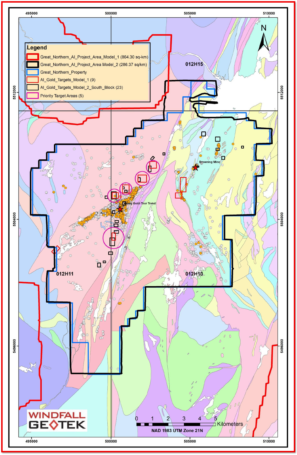Brossard, Québec - TheNewswire - April 21,2026 — Windfall Geotek Inc. (CSE: WIN; OTCQB: WINKF) ("Windfall" or the "Company"), a pioneer in AI-driven mineral exploration since 2005, the Company has completed district-scale machine-learning targeting at the Great Northern Project in northwest Newfoundland, generating 40 gold targets—including five high-priority zones confirmed by both models.