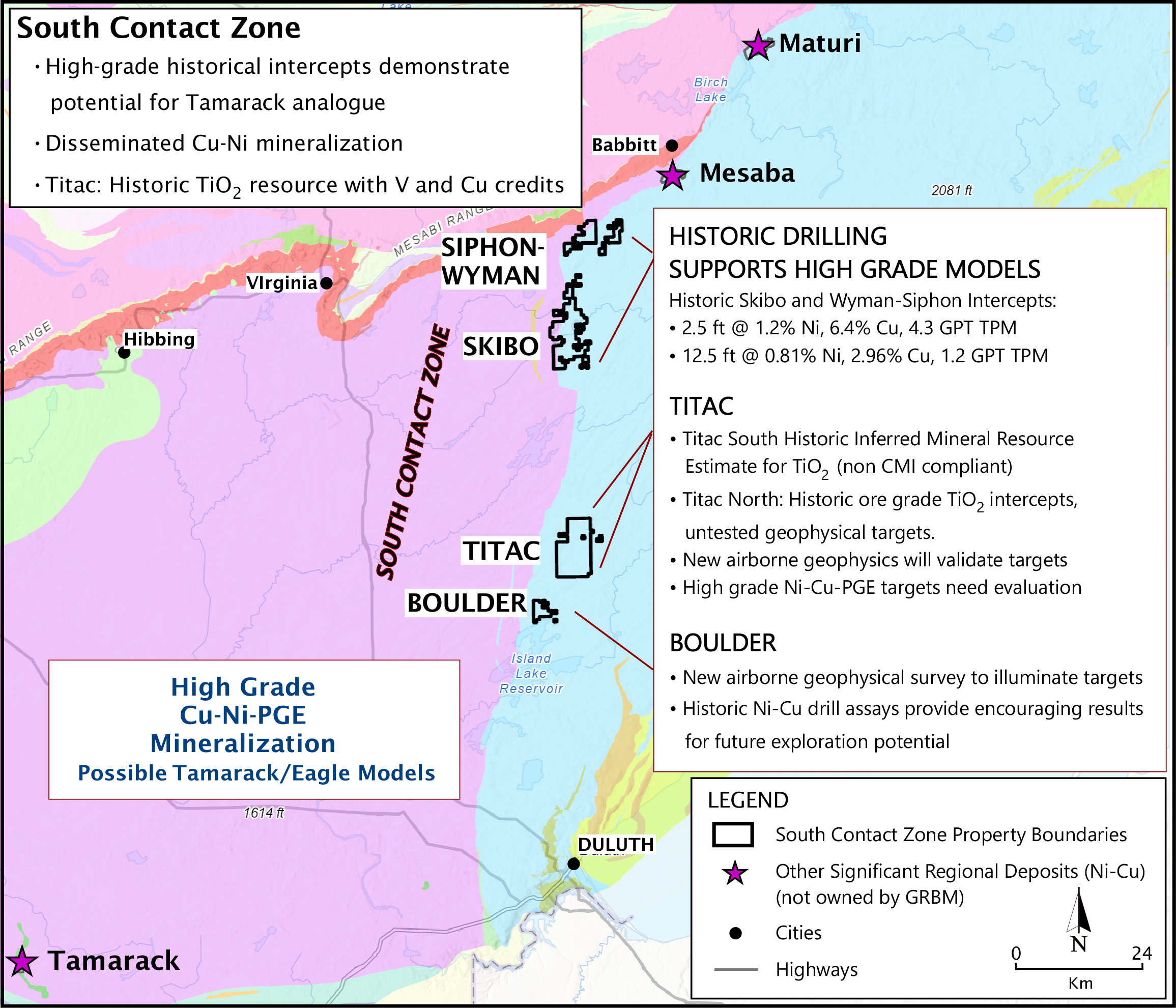 At the Titac South prospect, a historical TiO2 mineral resource exists with disseminated Cu-Ni-V mineralization accompanying the TiO2 (see August 25, 2024, News Release). Titac North also contains historical intercepts of TiO2- Cu-Ni-V mineralization. Both Titac South and Titac North are associated with relative magnetic high zones in the geophysical data. Importantly, another magnetic high zone has been identified at Titac East to the southeast of Titac South on the Titac property (Figure 3). Though similar in its magnetic response to known mineralization at Titac, this area has not been drill tested. Based on the findings above, the Company believes a VTEM survey over the Titac and Boulder prospect areas will highlight new drill targets along the Southern SCZ. The Company looks forward to informing the market of its drill plans based on a comprehensive analysis of historical and newly commissioned VTEM surveys in due course.