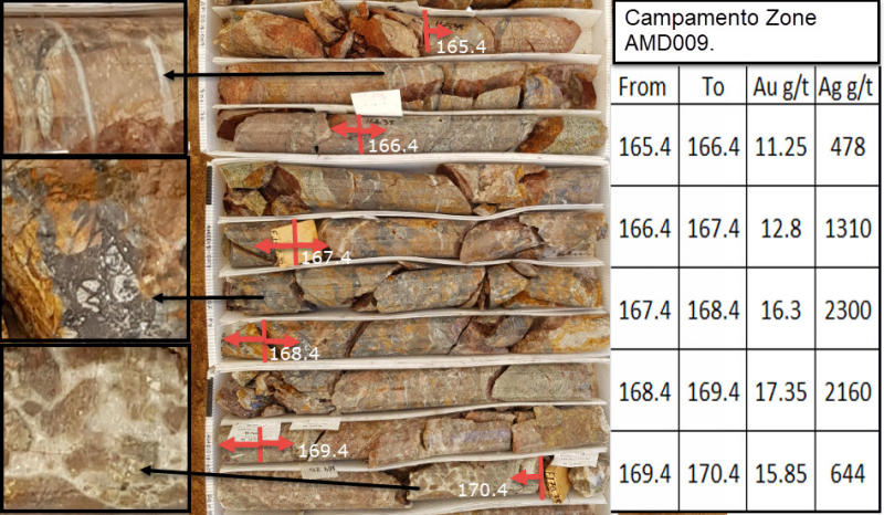 Five drill holes (AMD001 / 003 / 007 / 008 / 009) were drilled between the Campamento and San Pedro targets (Campamento Zone) defining a 650m strike length of epithermal banded veining, stockworks and multiphase breccia with significant gold and silver mineralization. A table of results is listed below. This initial drill program was designed to test the targets between 50 and 150m below ground surface. Considering the topography the drill holes cut mineralization in a range between 1988 m above sea level (asl) and 1882m asl, effectively testing the mineralization over a 100m vertical interval. AMD001 cut the zone highest in the system at 1988m asl and was still within the upper rhyolite host. AMD009 cut the system within the andesite host at the deepest level (1908m als) and recorded the best widths (26m) and highest grades with bonanza intervals, including 5m at 14.71 g/t Au and 1378 g/t Ag.