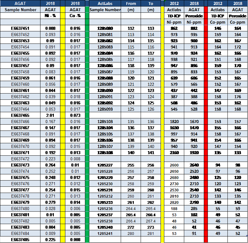 The Peroxide Fusion analysis which is a more accurate analysis for Cobalt and has returned on average higher results than the TD-ICP analysis done at the time of the drilling program in 2012.