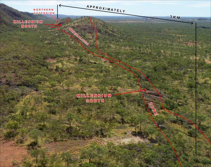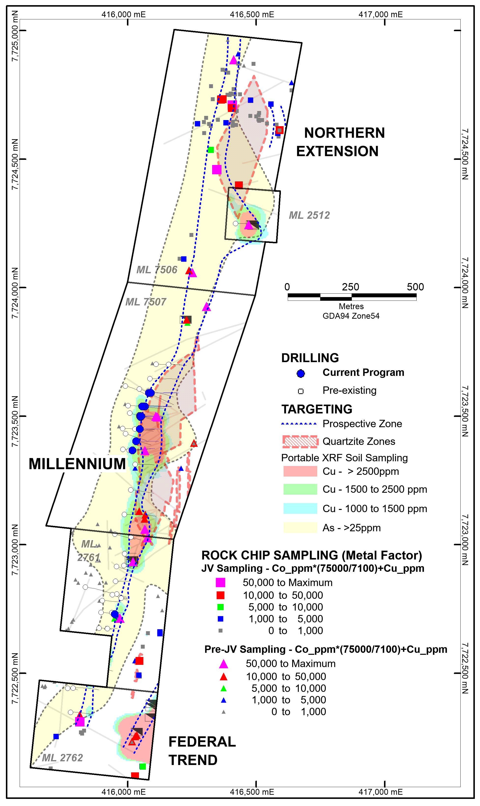 Rock chip sampling has been conducted to test for additional zones of cobalt and copper mineralisation along the Millennium trend and in particular the northern strike extension (“Northern Extension”) where similar host rock units and strong soil geochemical anomalies are located. This zone is located approximately 1 kilometre north of the current Millennium resource as defined.