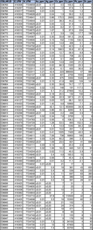 Peak values in the rock chip samples taken were 0.12% Co, 0.21g/t Au, 42.6g/t Ag, 45.3% Cu, 0.16% Pb and 0.25% Zn. A full rock chip listing is presented in Table 1. In total, 72 samples were collected for analysis. All samples were submitted for 4-acid digest followed by AAS assay for gold and ICP (OES) analysis for a multi-element suite including copper, silver, cobalt and molybdenum.