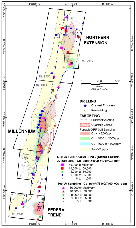 Features such as, the continuation of elevated soil arsenic and copper geochemistry, presence of anomalous cobalt and copper in rock chip samples and analogous geology between the Millennium resource area and the Northern Extension indicate that this area is a priority target for further investigation. These features are summarised in Figure 1. Drill targets are currently being finalised to further test this area.