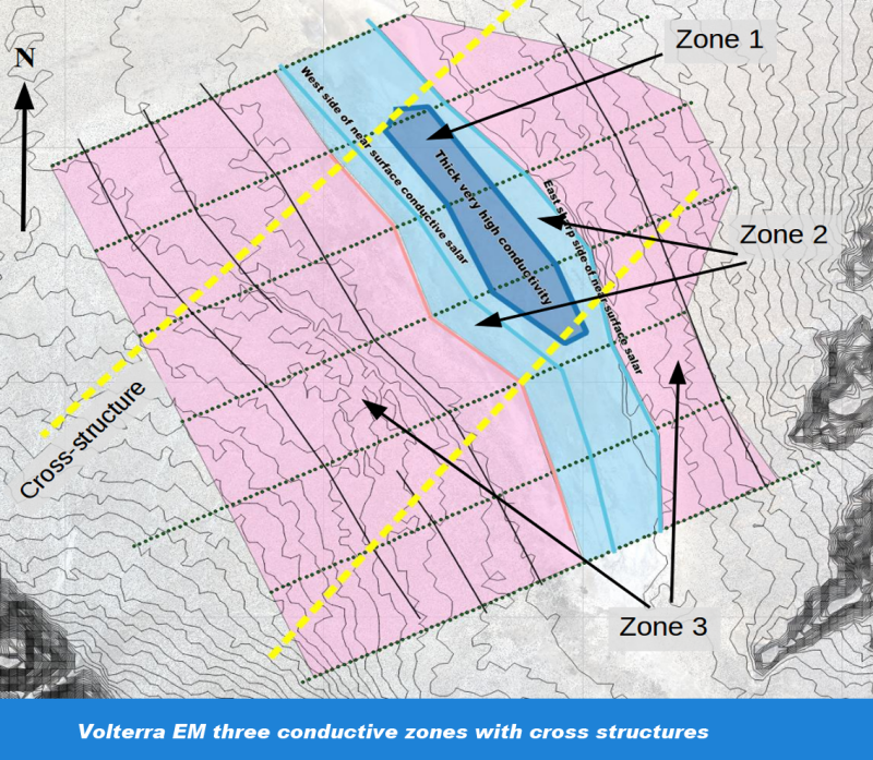 Syd Visser, President of SJ Geophysics Ltd. wrote “The survey’s objective was to delineate changes in conductivity that could represent conductive layers. The Salar del Diablo was considerably more conductive than expected.” As in other salars in North and South America that are in production or advanced exploration, the conductive layers could represent saline brines, which may contain elevated concentrations of lithium. The geophysical program at Salar del Diablo successfully identified three highly conductive zones.