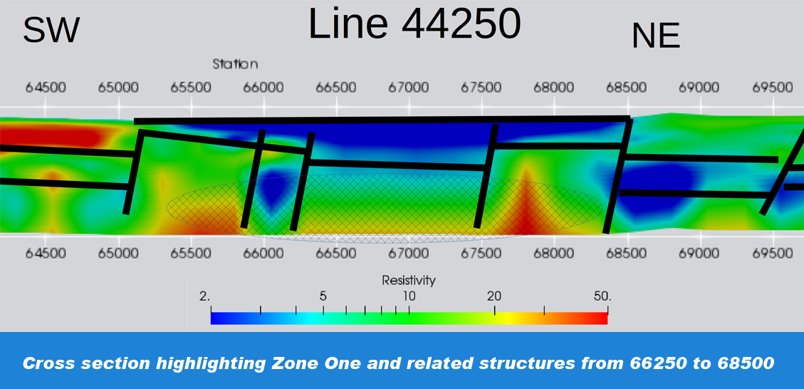 There may be two interpreted structures (both yellow lines) at the northwest and southeast ends that may constrain the highly anomalous Zone one.