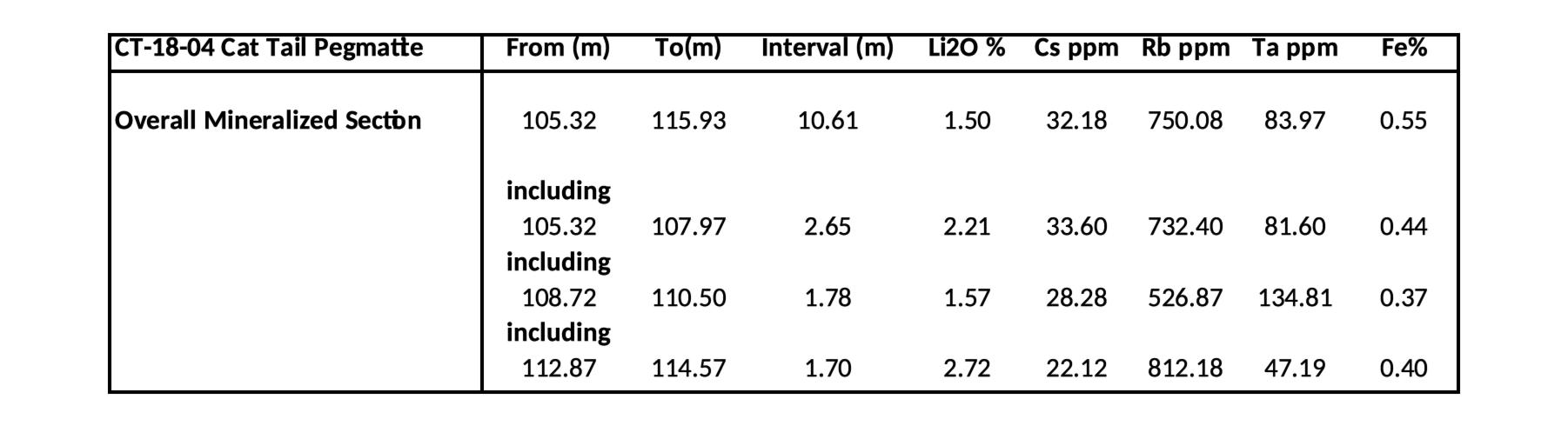 Table 1: Assay Table for CT-18-04, Cat Tail Pegmatite