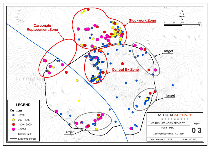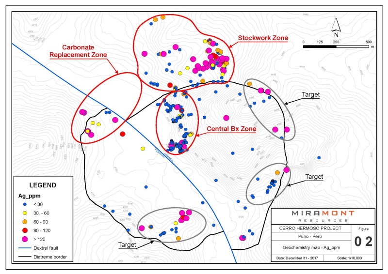 Vancouver, BC / TheNewswire / January 10, 2018 - Miramont Resources Corp. (CSE: MONT) (“Miramont” or the “Company”) is pleased to provide an update of progress at its Cerro Hermoso project in southern Peru. In Q4 2017, Miramont geologists successfully completed a systematic mapping and sampling program intending to define priority targets in preparation for drilling.
