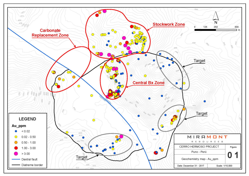 Central Breccia Zone – This gold-bearing hydrothermal breccia lays within the central portion of the Cerro Hermoso diatreme. Recent sampling by Miramont has expanded the size of the exposed Central Breccia Zone to an area of 500m by 200m. Miramont’s 2017 program returned encouraging gold results with high values of 18.4g/t, 10g/t and 9.3g/t, and 87 of the 178 samples returning anomalous Au > 0.1g/t. Historic channel sampling in the Central Breccia resulted in 43 meters averaging 1.8g/t which Miramont has subsequently confirmed with check samples.