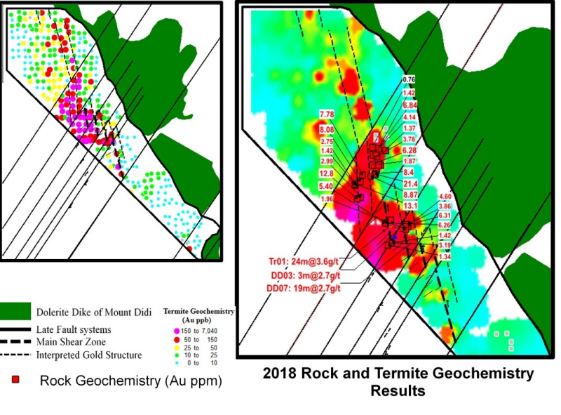 The Phase II RC drilling program is not dependent on the outcome from Phase I program and is intended to test new targets immediately north of the actual deposit that were discovered during the 2018 exploration works with high gold grade in rock chips and in termite mounds. The new discovered target extends over 1.5 km north of the actual deposit. The key exploration objectives to be addressed include: