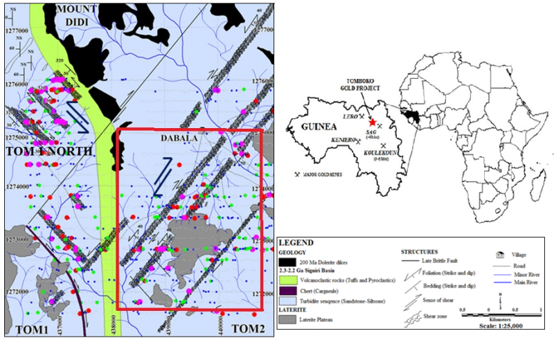 The Tomboko Gold Project is part to the Paleoproterozoic rocks of the Siguiri Basin, in the Birimian Super group of West Africa that host several multi-million-ounce gold deposits in operation (SAG at Siguiri operated by AngloGold -Ashanti and Lero at Lefa operated by Nordgold), one smaller gold mine at Kéniéro. Geological and structural relationships, petrographic and alteration assemblage demonstrate that the Tomboko gold deposit is a Mesothermal shear-zone-controlled, Orogenic-type gold mineralization, hosted in greenstone folded and faulted volcanoclastic successions. The structural evolution of the deposit as well as the gold mineralization style is identical to the nearby +8 Moz SAG Gold Deposit operated by AngloGold-Ashanti. The Tomboko Property can therefore, be considered as very prospective terrane to host an economic gold deposit considering that aggressive exploration works including extensive drilling program will continue to further define and delineate additional gold mineralization.